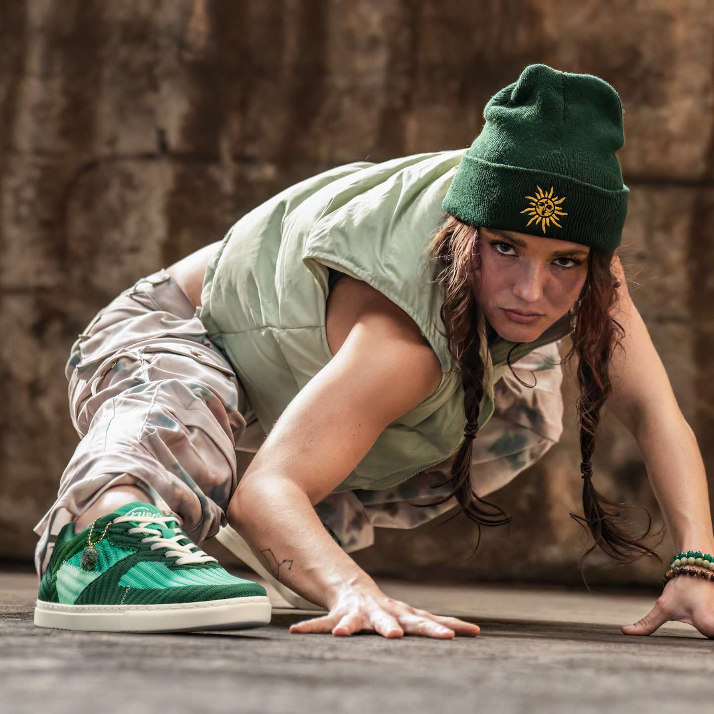 Designed in collaboration with Jade Chynoweth, world-renowned dancer, actress and social media sensation, this eco-friendly sneaker features a raw Jade stone and a knit fabric texture made from recycled plastic water bottles. Vibrate higher in any environment when you rock Jade x Fuego, our earthiest collab.
